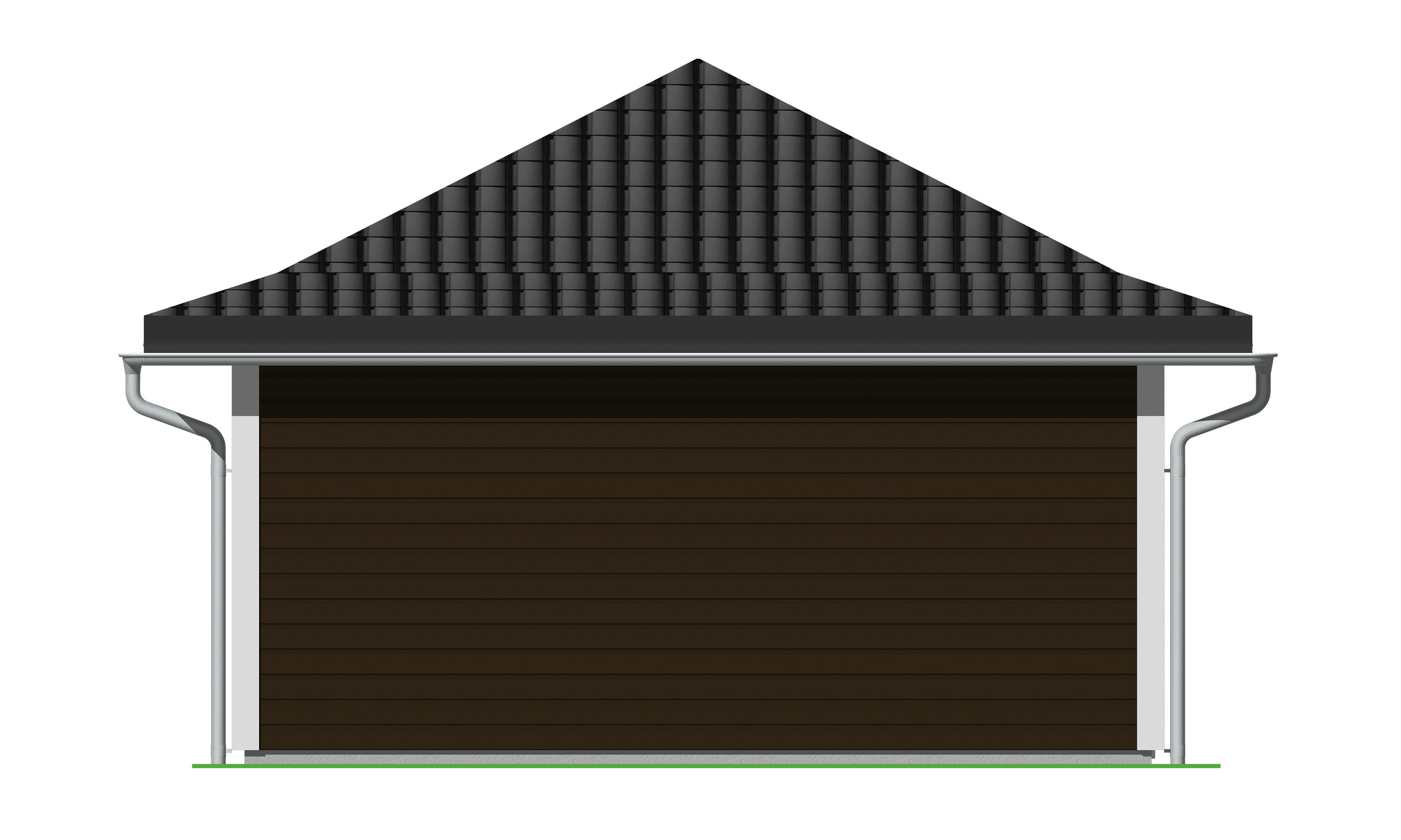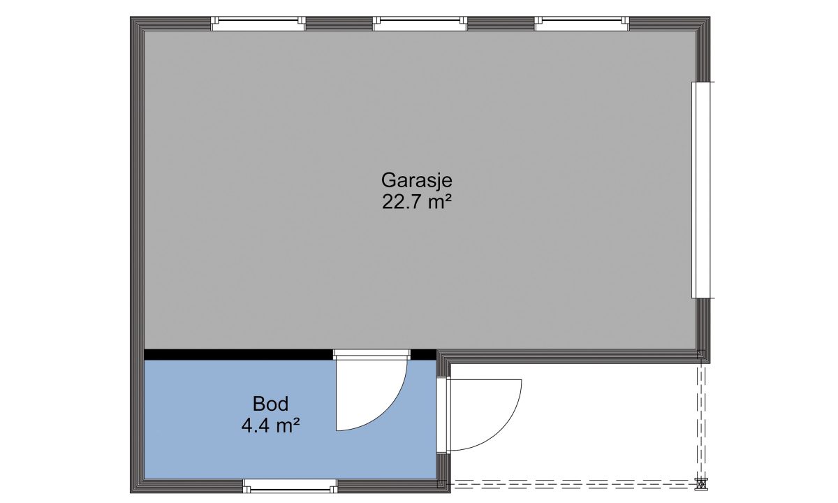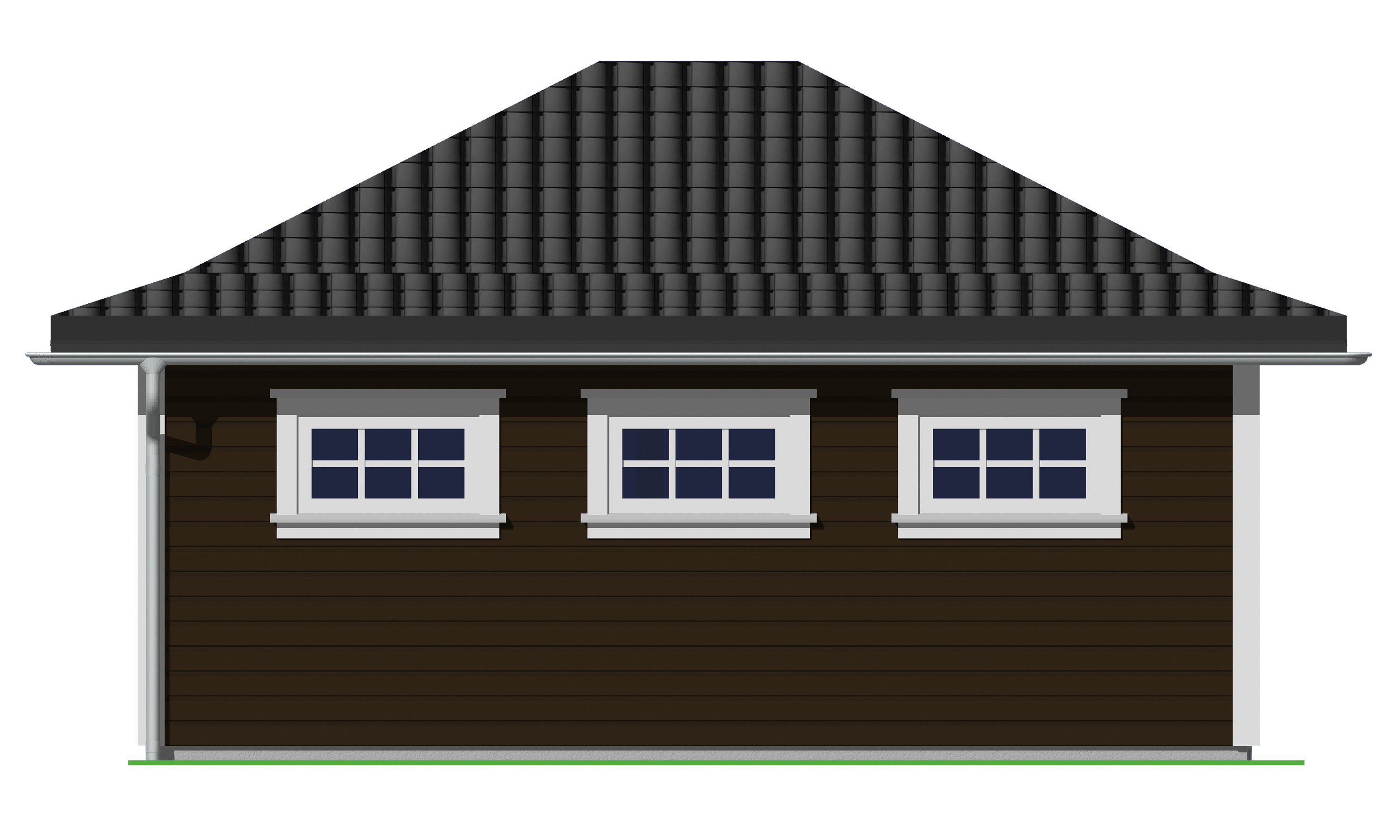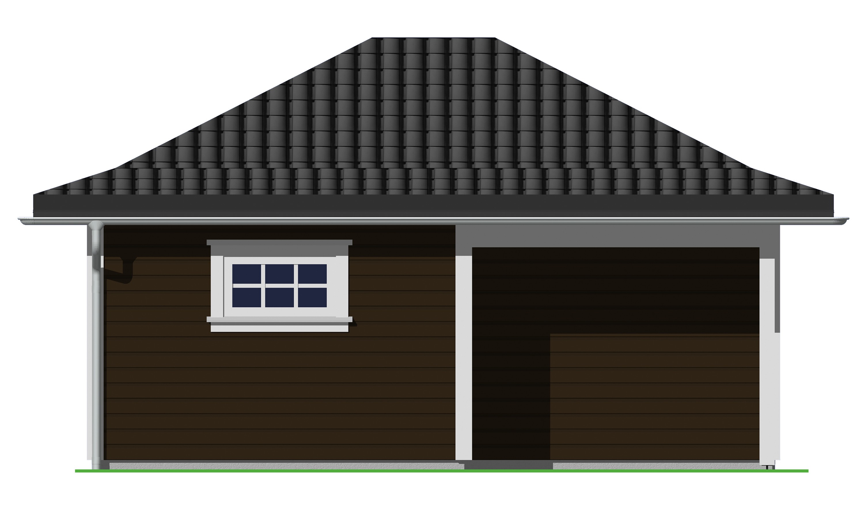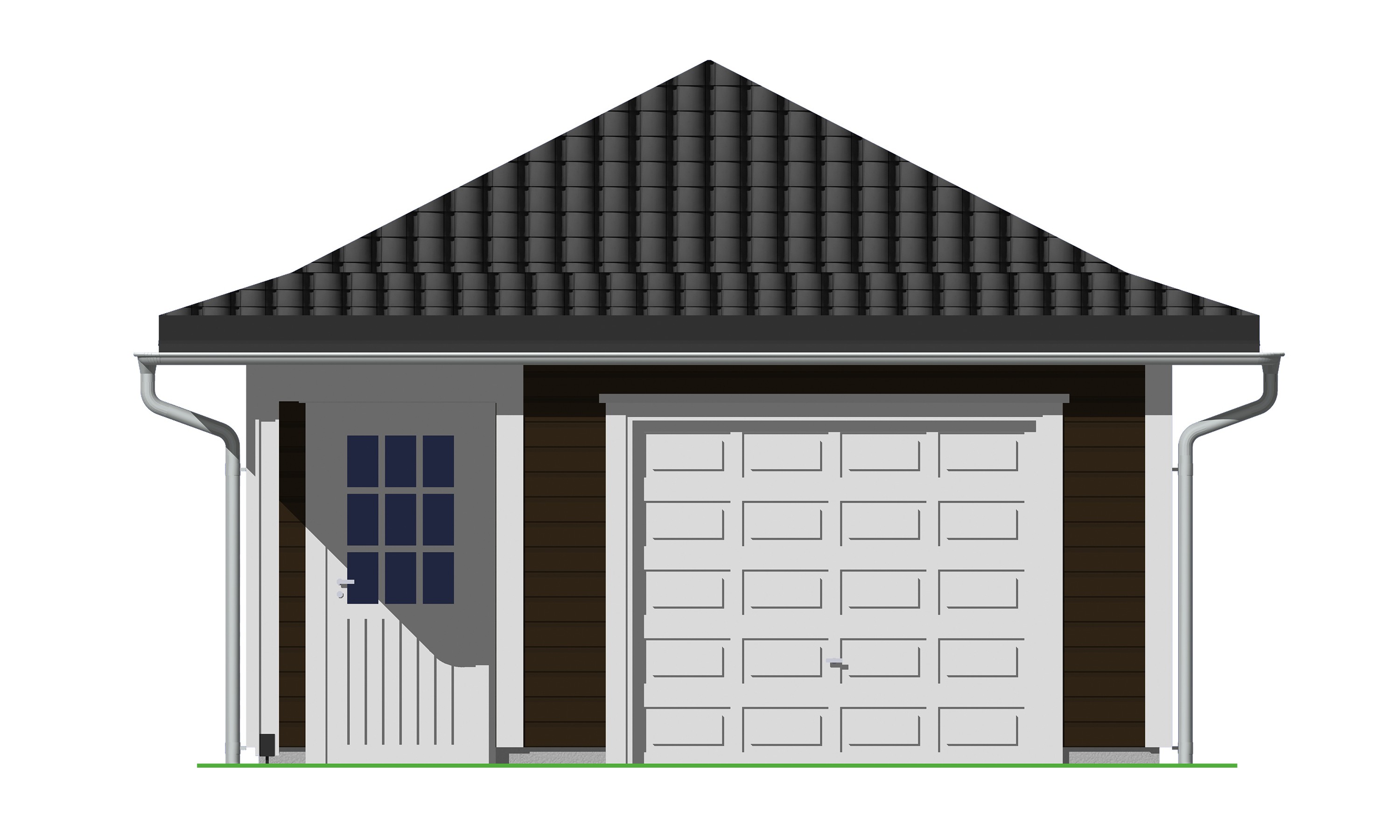 Tradisjonsrik garasje med valmtak og «kinavipp». Dør til boden er overbygd. Boden er også tilgjengelig fra garasjen.