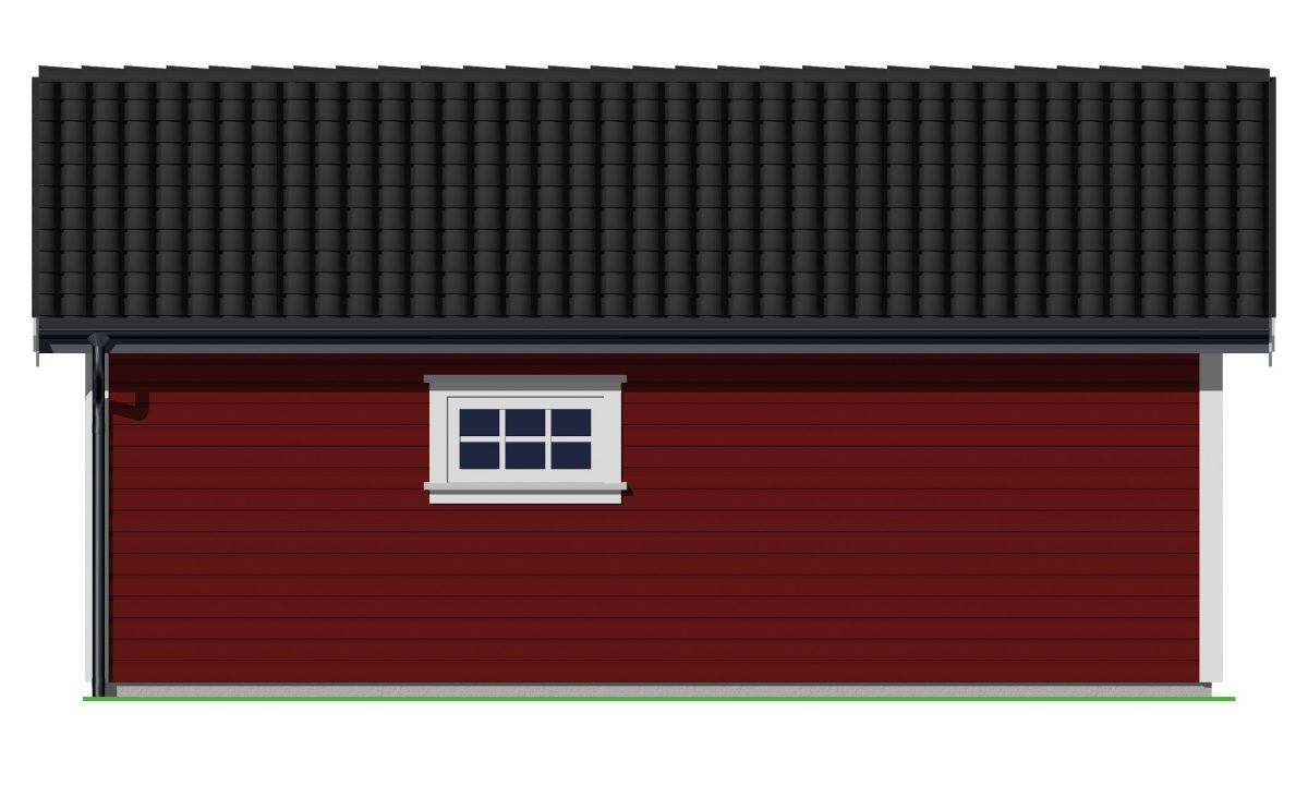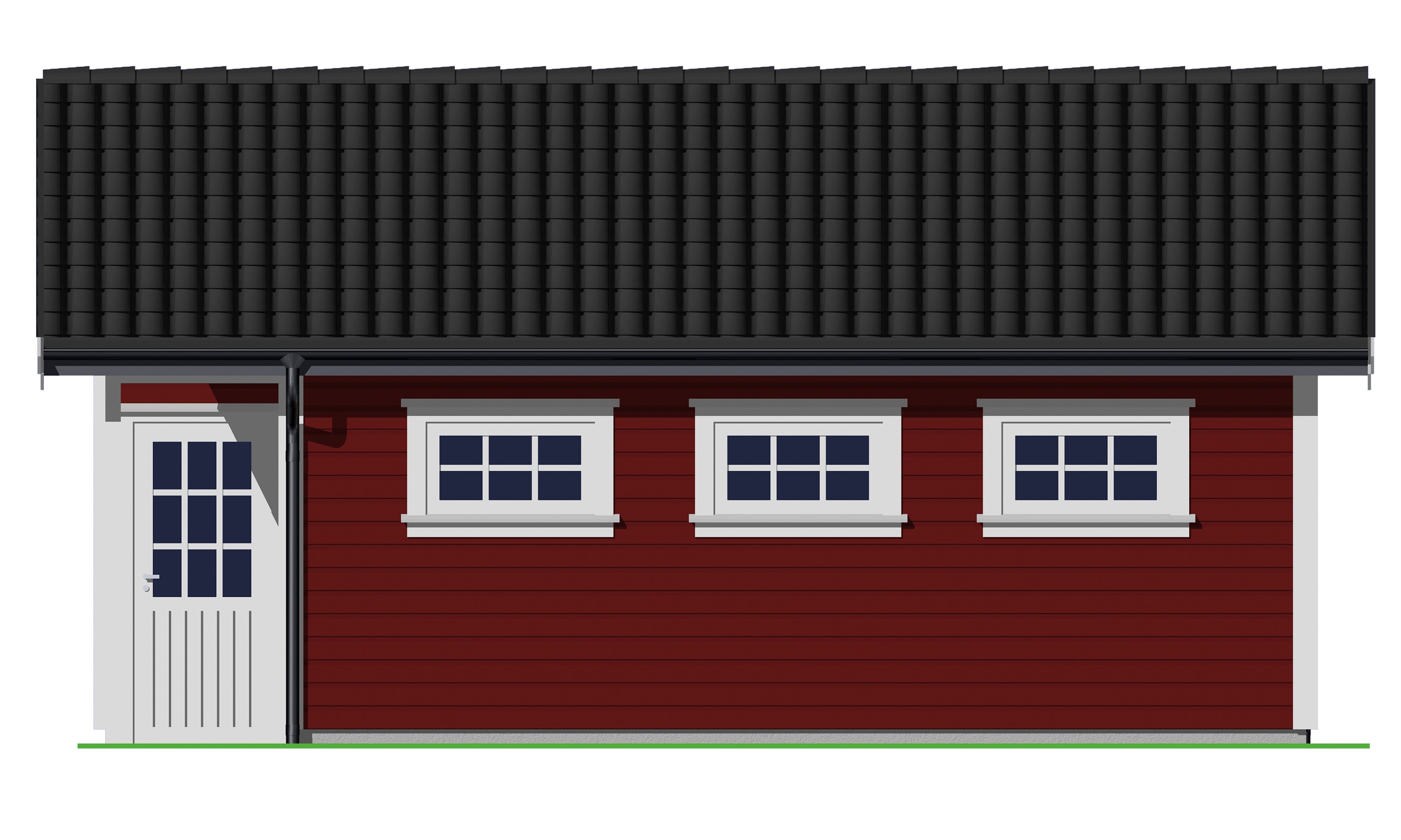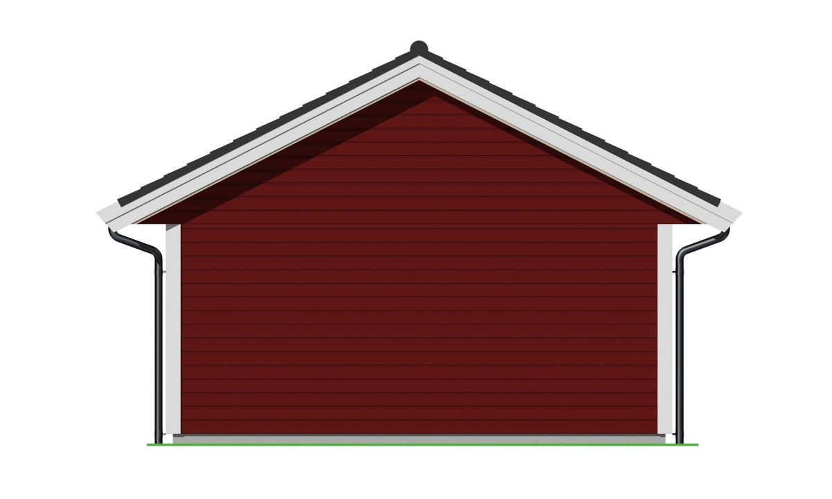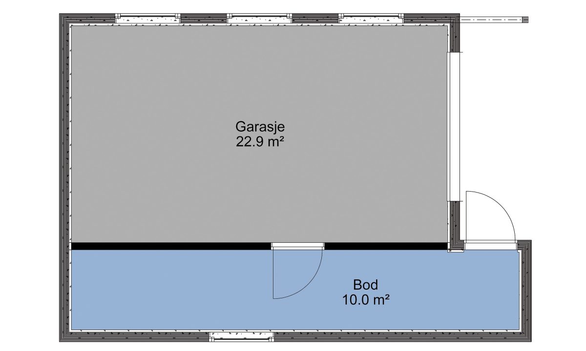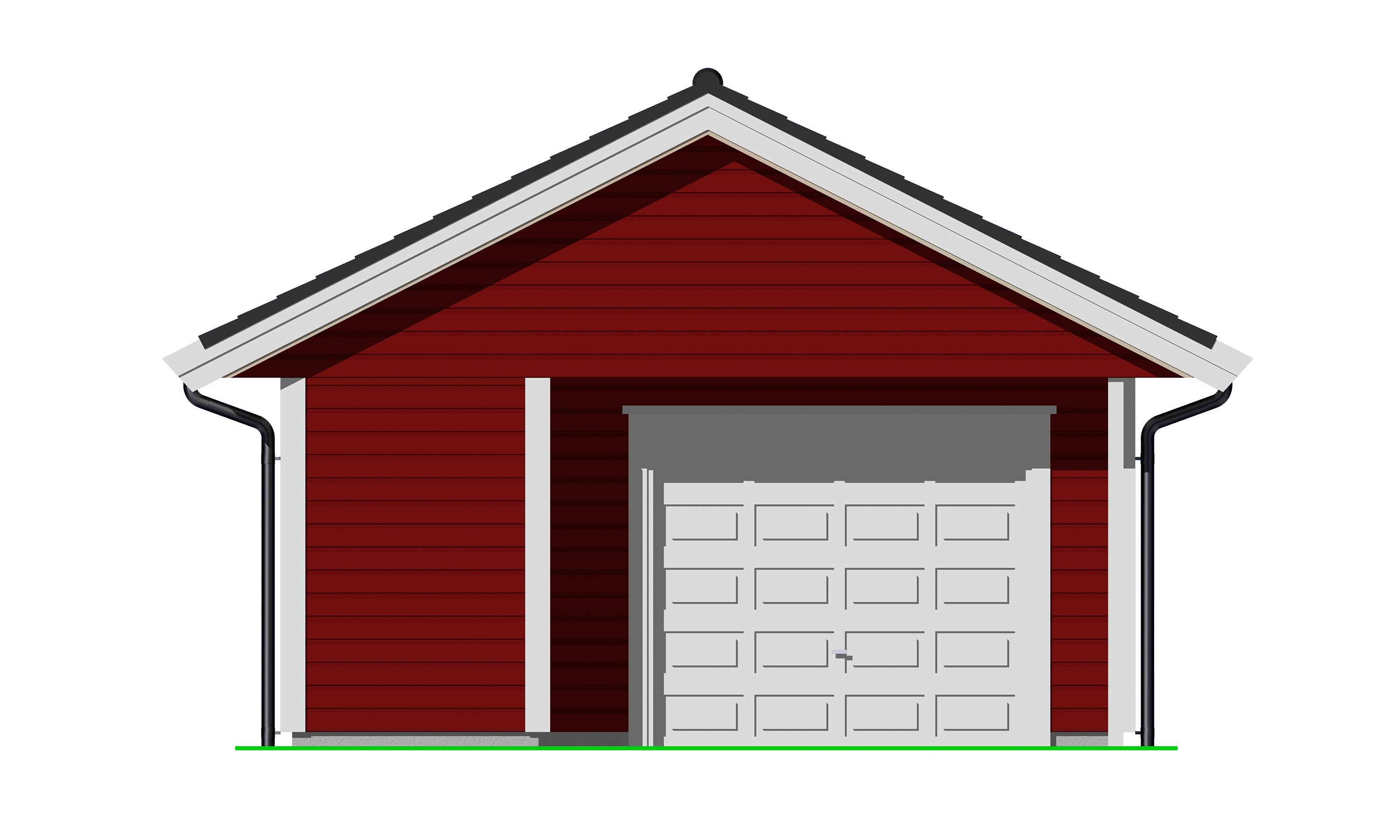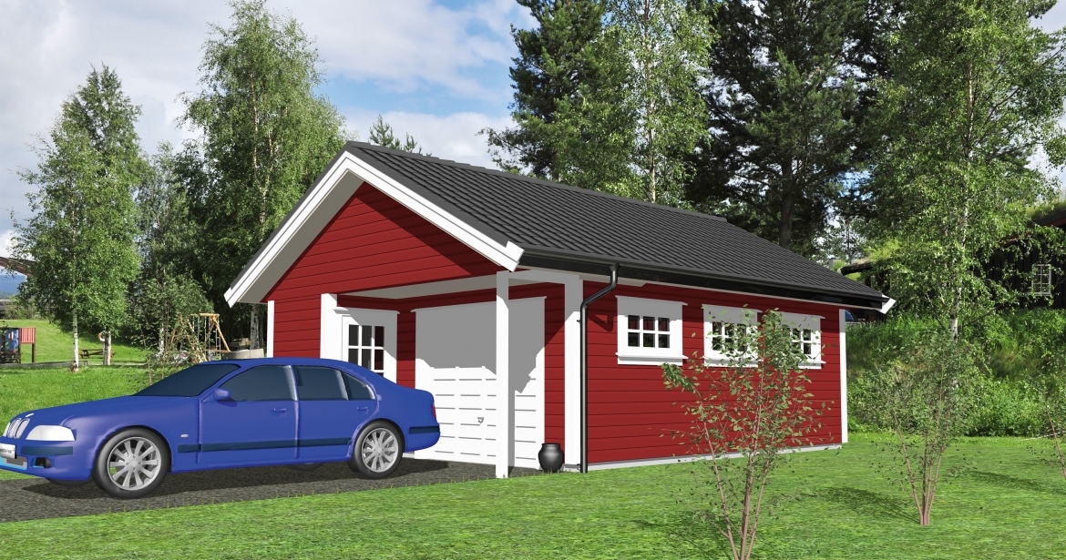 Tradisjonell garasje med overbygd port og dør til boden. Stor bod med tilgang også fra garasjen.