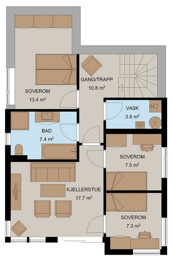 På baksiden finner du inngangspartiet som tar deg inn i boligens andre etasje. I tillegg til et soverom og et bad finner du i denne etasjen en åpen stue/kjøkkenløsning som har utgang til en koselig balkong på fremsiden av huset. I kjelleretasjen er det god tumleplass og her finner du både kjellerstue, tre soverom, bad og vaskerom. Ida har også en utvendig sportsbod som er lokalisert rett ved hovedinngangen til boligen.
