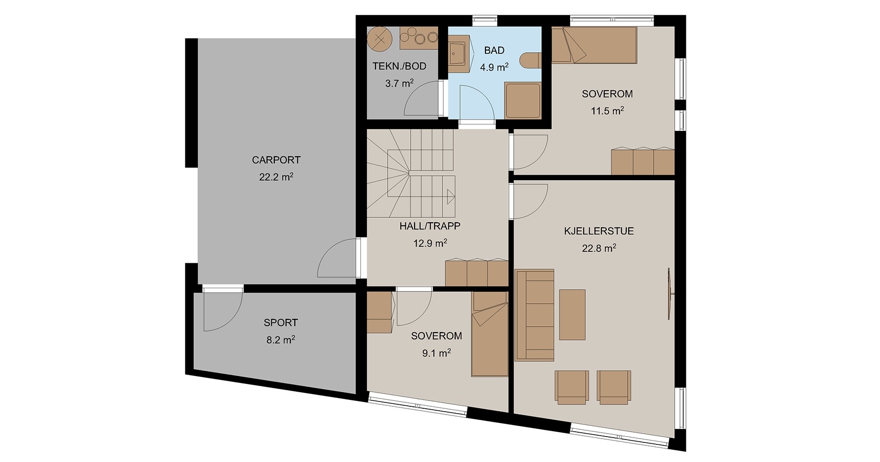 Denne boligen kombinerer eksklusivt og moderne design med den sunne fornuften. Du kommer inn i boligens første etasje via overbygd inngang i carport. I hallen er det god plass til oppbevaring, og du har tilgang til to av boligens tre soverom, samt bad, bod og en åpen kjellerstue på hele 23m2. En utvendig sportsbod med adkomst fra carport gir god lagringsplass.