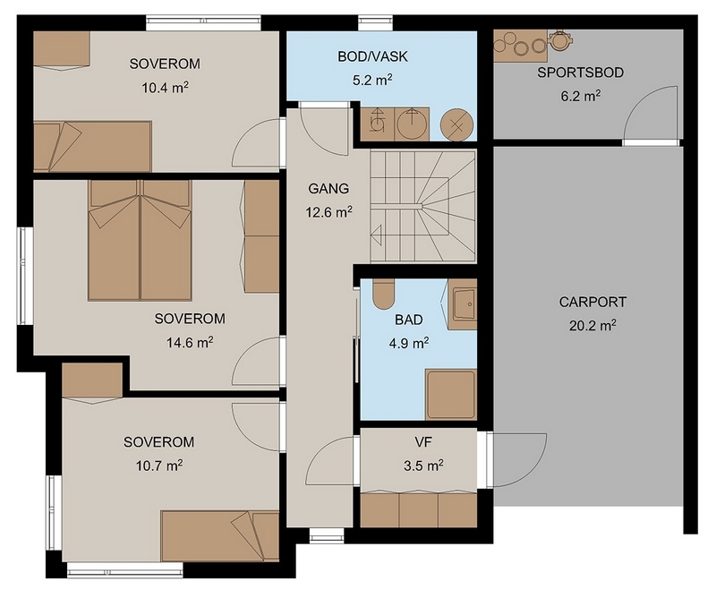 Boligen har fire soverom, hvorav tre av dem er plassert i første etasje. Der finner man også et bad og et romslig vaskerom som har mulighet for oppbevaring. I hovedetasjen finner du soverom, bad og en åpen stue og kjøkkenløsning som har utgang til en koselig overbygd terrasse.