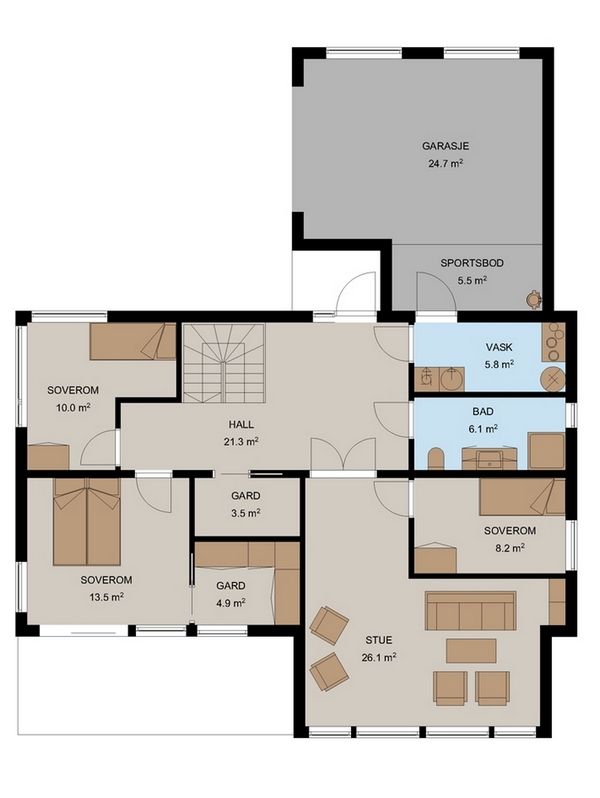 Boligen rommer også en romslig garasje med tilhørende sportsbod og et skjermet inngangsparti. Flotte vindusløsninger gir dette huset særpreg og er boligen for deg som ønsker et moderne hjem med god plass.