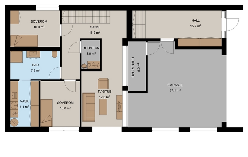 Fra den store garasjen med tilhørende sportsbod kan du gå tørrskodd inn i boligen.
